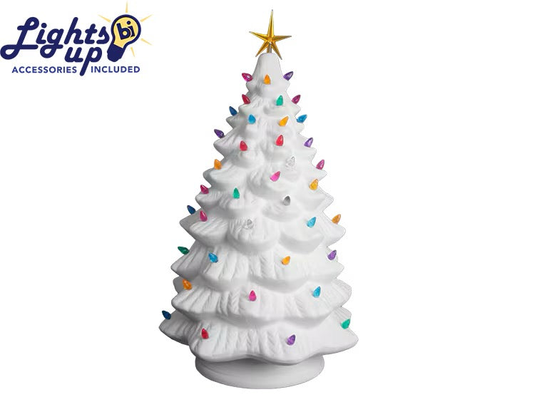 Light up your tabletop this season with the Lighted Christmas Tree! This ceramic Christmas tree comes with a tree, base, light kit that includes base light bulb, colorful mini lights and yellow star tree topper. Large Tree Measures 18" H (with base) x 11"