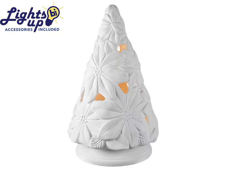 This festive piece features a beautifully detailed poinsettia tree design, perfect for adding vibrant colors and holiday sparkle. Once painted, insert the LED bulb (included) to illuminate your creation, making it a stunning centerpiece for your seasonal decor. Ideal for holiday-themed parties, creative activities, or as a unique gift, this bisque shape adds a warm and joyful touch to any home during the festive season. Tree Measures 14 ¼" H x 9" Dia